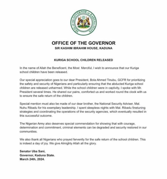 The press release said “Our special appreciation goes to our dear Mr President President Bola Ahmed Tinubu GCFR for prioritizing the safety and security of Nigerians and particularly ensuring the abducted kuriga children have been released unharmed…”