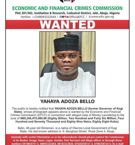 The EFCC has declared ex-Governor Yahaya Bello wanted for alleged crimes of stealing N80 billion from the Kogi treasury.