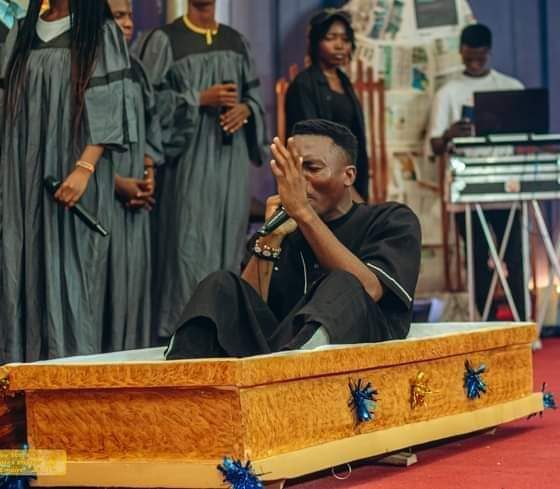 A gospel singer, Samuel Oguche aka Onoja, caused a stir online after he shared photos from his ministration, where he arrived in a coffin.