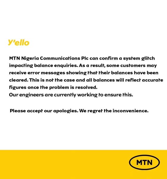 The MTN Nigeria has in a press release this afternoon has stated that they had a “system glitch and their team is swiftly fixing it” an further stated that “all balances will reflect accurate figures once the problem is resolved”